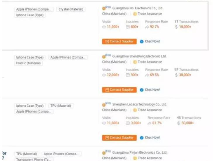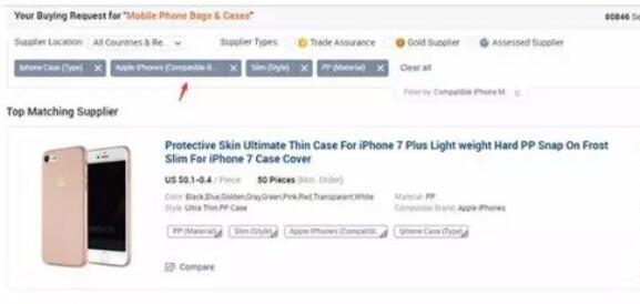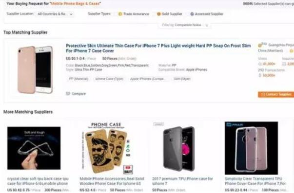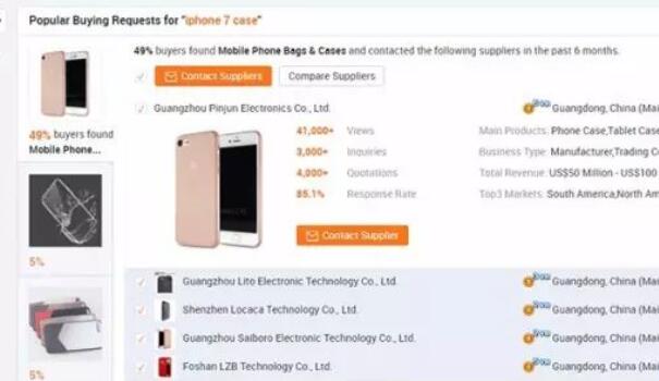 搜索關(guān)鍵詞如iphone 7 case,Ctrl+End定位到頁(yè)面最下面Popular Buying Requests for “iphone 7 case”版塊,點(diǎn)擊一家供應(yīng)商打開(kāi)