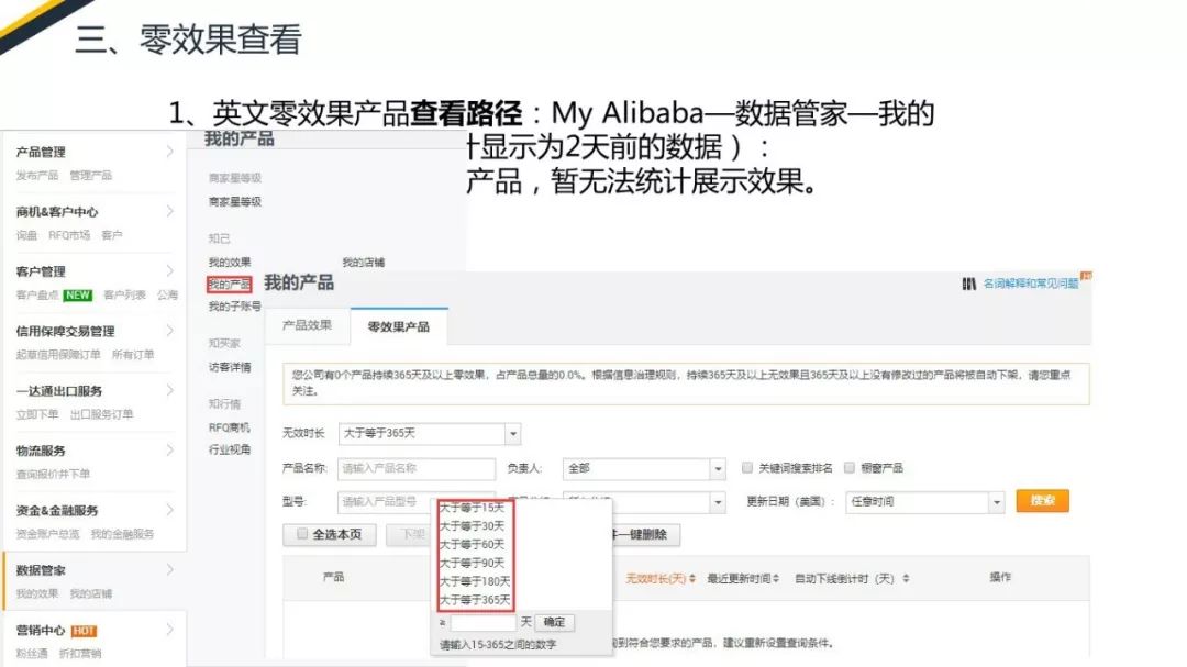 查看路徑教大家一下,My Alibaba界面,點擊數(shù)據(jù)管家,進入到我的產(chǎn)品這樣一個界面。在我的產(chǎn)品這個界面里面是分為兩塊的。第一塊產(chǎn)品的效果,第二塊零效果產(chǎn)品。點擊第二塊零效果產(chǎn)品,就可以看到平臺的零效果產(chǎn)品。 統(tǒng)計的數(shù)據(jù)顯示為兩天前的數(shù)據(jù),官方在設(shè)置工具的時候,將零效果的實現(xiàn)進行了一個分段。分別有365天以上的,180以上的,90天以上的,60天以上的,30天以上的,15天以上的。并且你可以不使用人工進行輸入。第二個,多元市場的零效果產(chǎn)品暫時是沒法被統(tǒng)計到的。如果你發(fā)布了大量的多元產(chǎn)品并且效果不好,我的建議可以直接刪除,再重新進行發(fā)布。