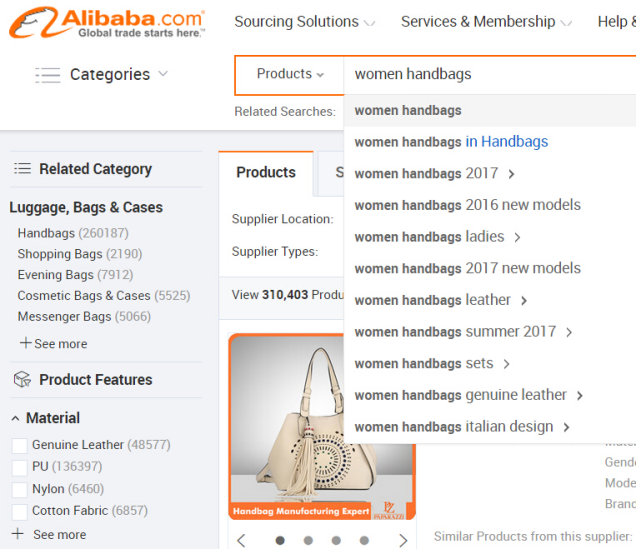 目前阿里巴巴國際站的搜索引擎,主要索引標題、關(guān)鍵詞和產(chǎn)品屬性。阿里自2015年逐步引入買家偏好權(quán)重,我們可利用這一要素,在發(fā)布產(chǎn)品時利用屬性主動去匹配買家偏好。舉個例子,在alibaba.com搜索women handbags這個關(guān)鍵詞,會有相關(guān)詞的推薦: