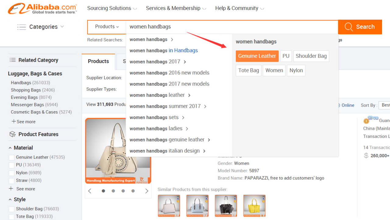 當我們把鼠標放在women handbags上時,下拉框右側(cè)會給出擴展詞,比如排在第一位的Genuine Leather: