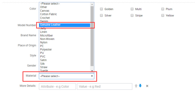 點擊Genuine Leather后篩選出的產(chǎn)品中,系統(tǒng)屬性里的“材質(zhì)”都會出現(xiàn)Genuine Leather。
