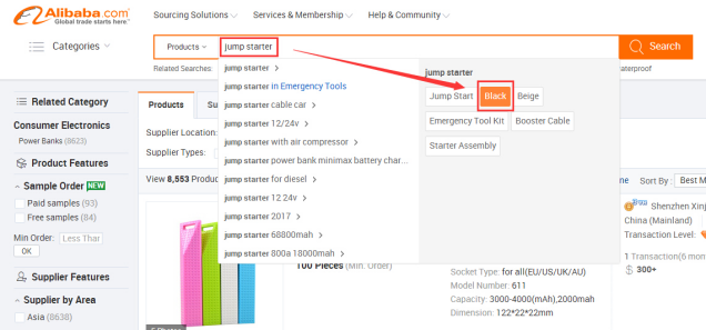 例如搜索jump starter有個下拉框的擴展詞是Black :