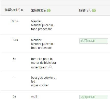 3.訪客詳情之常用搜索詞:整理訪客常用搜索詞,在里面找出使用次數(shù)比較多而且匹配你的產(chǎn)品的關(guān)鍵詞。這些關(guān)鍵詞會(huì)比你去自己翻譯,亂找有效很多很多,因?yàn)檫@是訪客使用的,訪客行為其實(shí)一定程度上代表著大部分買家的習(xí)慣,阿里排名規(guī)則中買家喜好程度占了很大的比重,所以我們?cè)谧霎a(chǎn)品的時(shí)候,要從各個(gè)方面去契合買家的習(xí)慣和愛(ài)好,從訪客詳情中提煉出買家常用搜索詞作為產(chǎn)品關(guān)鍵詞,這會(huì)是一個(gè)不錯(cuò)的方向!