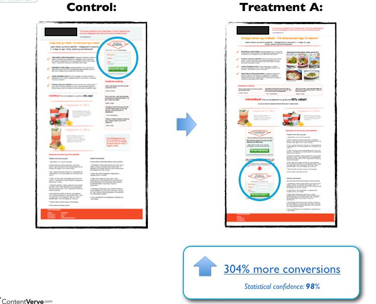 CTA出現(xiàn)的位置很關(guān)鍵,下圖是一份關(guān)于CTA位置的網(wǎng)絡(luò)營銷實驗數(shù)據(jù)分析報告:提升了304%的轉(zhuǎn)化