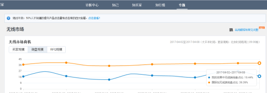 我們以“詢盤規(guī)?!睘槔匆幌滤{(lán)色曲線是“我的效果中無線端詢盤占比”和橙色曲線“國際站無線端詢盤占比”,如圖,橙色數(shù)字是39.39%,表示整個(gè)國際站無線端詢盤占了近4成,藍(lán)色19.44%,說明自己的無線端詢盤占比只有不到2成。也就是說,藍(lán)色曲線在橙色線的下面,也就是說明“你無線端詢盤流量”不如“行業(yè)平均值”。