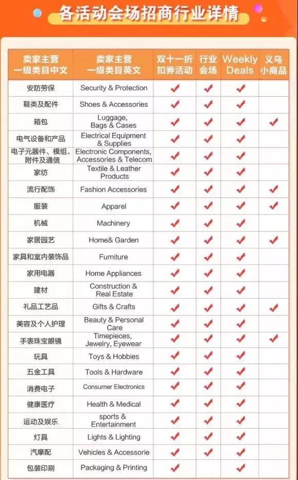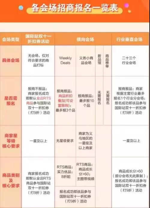 對于招商報(bào)名門檻,參加活動商品需是滿足風(fēng)控條件的RTS商品,其中Weekly Deals會場無商家星等級要求,其余會場報(bào)名要求商家星等級在一星以上。并且參與此次雙11活動的所有商家為中國大陸、香港臺灣地區(qū)出口通、全球?qū)毣蚪鹌氛\企中用戶。