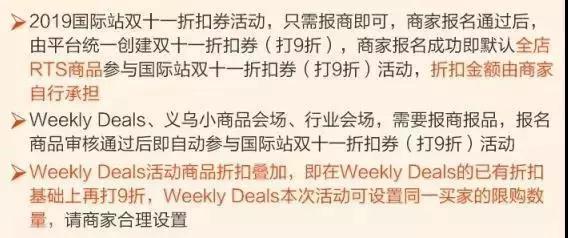 在招商說明方面,活動中的Weekly deals、義烏小商品會場與行業(yè)會場需要報(bào)商報(bào)品,報(bào)名商品審核通過后即自動參與國際站雙十一折扣券(打9折)活動。而且Weekly deals活動商品可折扣疊加,即在weekly deals的已有折扣基礎(chǔ)上再打9折。