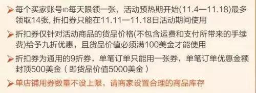 另外,今年阿里國際站給出的雙11折扣券買家使用規(guī)則顯示,此次活動期間使用的折扣券為通用的9折券,是針對活動商品的貨品價(jià)格(不包含運(yùn)費(fèi)和支付所帶來的手續(xù)費(fèi))給予九折優(yōu)惠,且貨品價(jià)值必須滿100美金才能使用。并且,每個(gè)買家賬號id每天限領(lǐng)一張,活動預(yù)熱期間(11.4—11.18)最多領(lǐng)取14張。