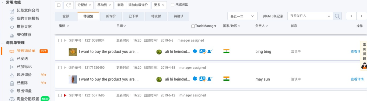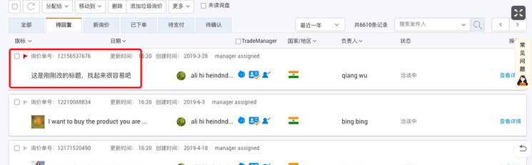 在所有詢價單列表篩選待回復的詢盤如下圖,標題幾乎一樣,之前聊過什么看不出來,只能一封一封點進去看,其實不用這么麻煩,用好這個小功能就可以了