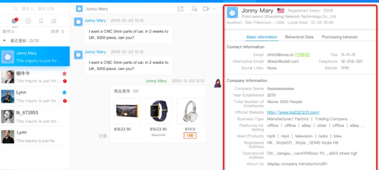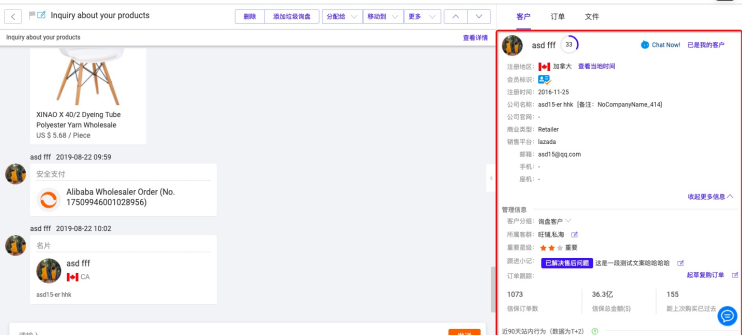 如果說商機列表頁的信息讓你對買家有了第一印象,進(jìn)入到詢盤詳情頁后,通過右側(cè)的客戶列表,你將獲取到更多跟買家相關(guān)的信息,對報價和跟進(jìn)策略有非常大的影響,網(wǎng)上有很多客戶身份分析的方法,比如通過email搜索,Googlemap定位等等,這里我們就不多說了,大家有興趣可以去網(wǎng)上搜一下,這里需要提到的是有些時候買家的信息設(shè)置了隱藏,很多信息就看不到了,這個問題我們在名片交換章節(jié)會告訴大家如何破解