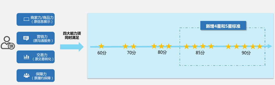 豐富指標(biāo)體系,強(qiáng)調(diào)買家核心關(guān)注點(diǎn),四大能力項(xiàng)一次升級(jí)為:商家力/商品力、營(yíng)銷力、交易力、保障力;②.細(xì)化分層標(biāo)準(zhǔn),凸顯更多優(yōu)質(zhì)商家,在3星之上孵化出4、5星。1-5星四大能力項(xiàng)分?jǐn)?shù)要求分別是60-70-80-85-90.(可見(jiàn)圖)