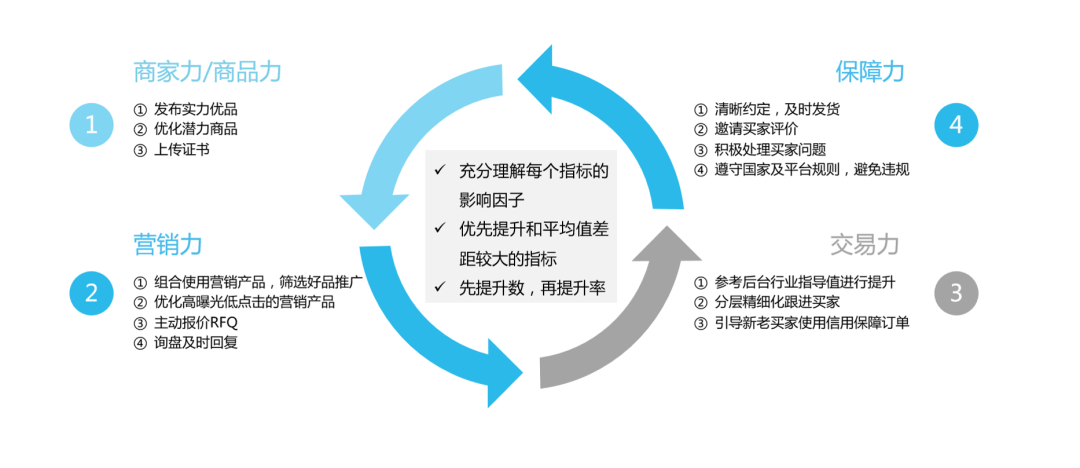 針對(duì)先易后難,在商家力/商品力和保障力是基礎(chǔ),也是相對(duì)容易的提分項(xiàng),如這兩項(xiàng)沒(méi)有達(dá)到60分,應(yīng)首先進(jìn)行優(yōu)化提升。營(yíng)銷力是商家多場(chǎng)景觸達(dá)買家的能力體現(xiàn),需要商家不斷地花費(fèi)心思進(jìn)行優(yōu)化,并通過(guò)時(shí)間沉淀展現(xiàn)。交易力是最終效果的直接體現(xiàn),繩鋸木斷、水滴石穿,只有在平臺(tái)上不斷地耕耘,才會(huì)有巨大的收獲。
