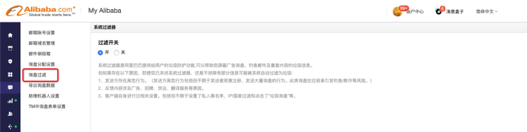 系統(tǒng)會(huì)根據(jù)發(fā)件人、主題、詢(xún)盤(pán)內(nèi)容等綜合信息進(jìn)行判斷識(shí)別,自動(dòng)過(guò)濾帶有特殊的敏感字眼、廣告行為等的詢(xún)盤(pán),您可以在【My Alibaba左側(cè)菜單——商機(jī)溝通——設(shè)置——詢(xún)盤(pán)過(guò)濾——系統(tǒng)過(guò)濾器】頁(yè)面開(kāi)啟或關(guān)閉該功能