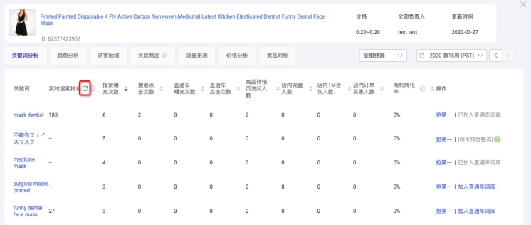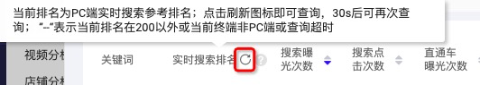 查詢位置:My alibaba-數(shù)據(jù)管家行業(yè)版-產(chǎn)品分析-任選一個產(chǎn)品的產(chǎn)品360-關(guān)鍵詞分析-實(shí)時搜索排名(右側(cè)刷新按鈕,如下紅框)