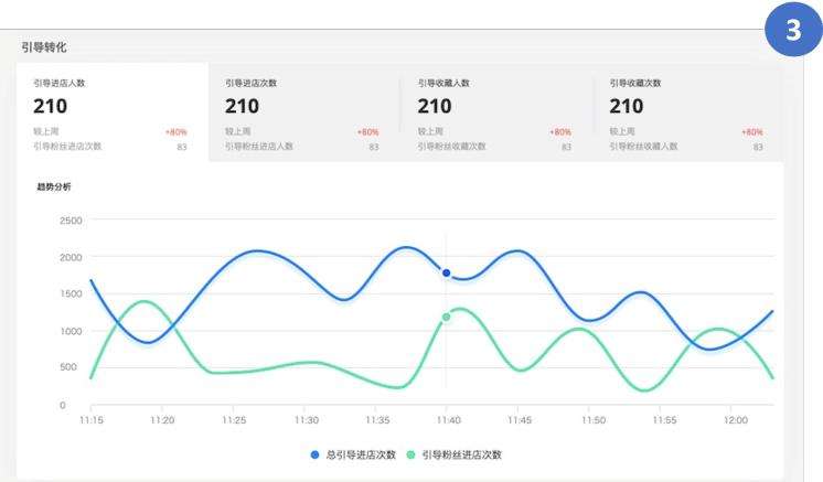 引導(dǎo)進(jìn)店次數(shù):選擇的時(shí)間范圍里,所有內(nèi)容引導(dǎo)訪問(wèn)旺鋪?lái)?yè)面和商品詳情頁(yè)面的次數(shù)
