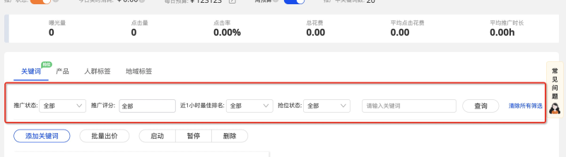 推廣狀態(tài):篩選當前不同狀態(tài)的關鍵詞;