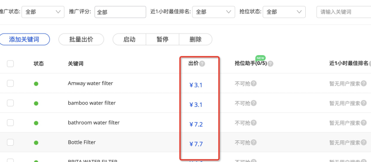 依次展示:關鍵詞、出價、搶位狀態(tài)、近1小時最佳排名、24小時排名分布、推廣產(chǎn)品數(shù)(該關鍵詞當前關聯(lián)產(chǎn)品數(shù))、該關鍵詞推廣評分、該關鍵詞搜索熱度、購買競爭度、曝光、點擊、詞花費、點擊率、該關鍵詞同行平均出價;