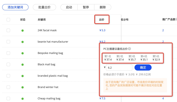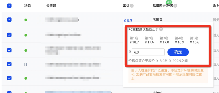 會根據(jù)關鍵詞當前的競爭數(shù)據(jù),給到您進入PC主搜的建議價格,您在當前界面設置完畢價格后,點擊確定即可;