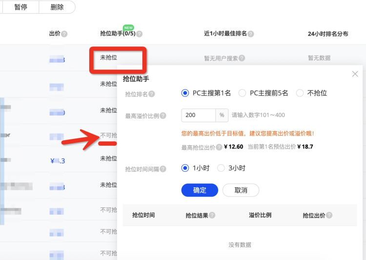 搶位助手溢價*該關鍵詞出價*人群/地域溢價(選擇溢價更高的標簽溢價)=實際最高出價