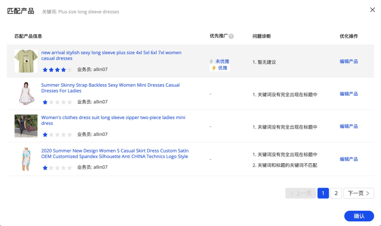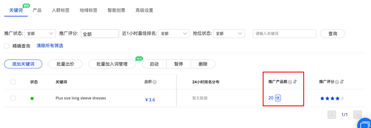 點擊【推廣產(chǎn)品數(shù)】下方的數(shù)字,即可查看當前該關鍵詞所關聯(lián)的對應商品;(此處可以設置優(yōu)先推廣)