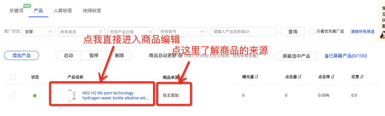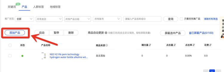 - 您的自主添加商品除非您手動刪除,否則不會因您開啟商品自動更新,而被踢出計劃,不被推廣;(如您自主添加的商品在屏蔽品當中,則該產(chǎn)品還是會被推廣、產(chǎn)生花費的哦)