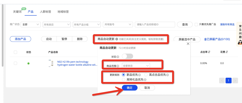 添加方式2:您可以點擊【商品自動更新】,設置不同類目商品自動更新加入計劃(新品優(yōu)先、高轉(zhuǎn)化優(yōu)先、高點擊優(yōu)先);