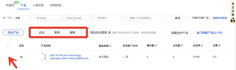 您可以先勾選商品,再點擊啟動、暫停或刪除,完成批量操作;
