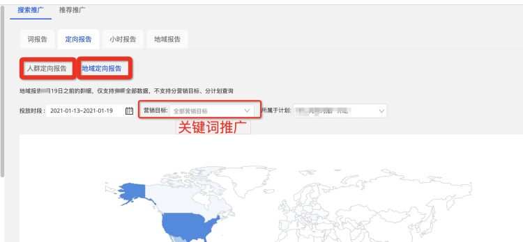 新增數(shù)據(jù)部分:您可以點擊定向報告,篩選關鍵詞推廣營銷目標,查看您的人群、地域報告;