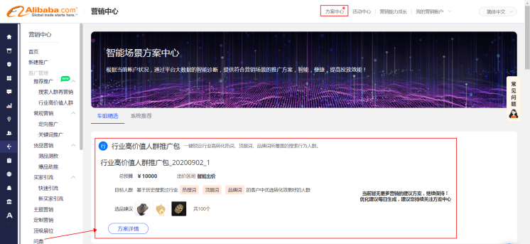 第一步:點(diǎn)擊進(jìn)入方案中心,找到行業(yè)高價(jià)值人群推廣,點(diǎn)擊方案詳情