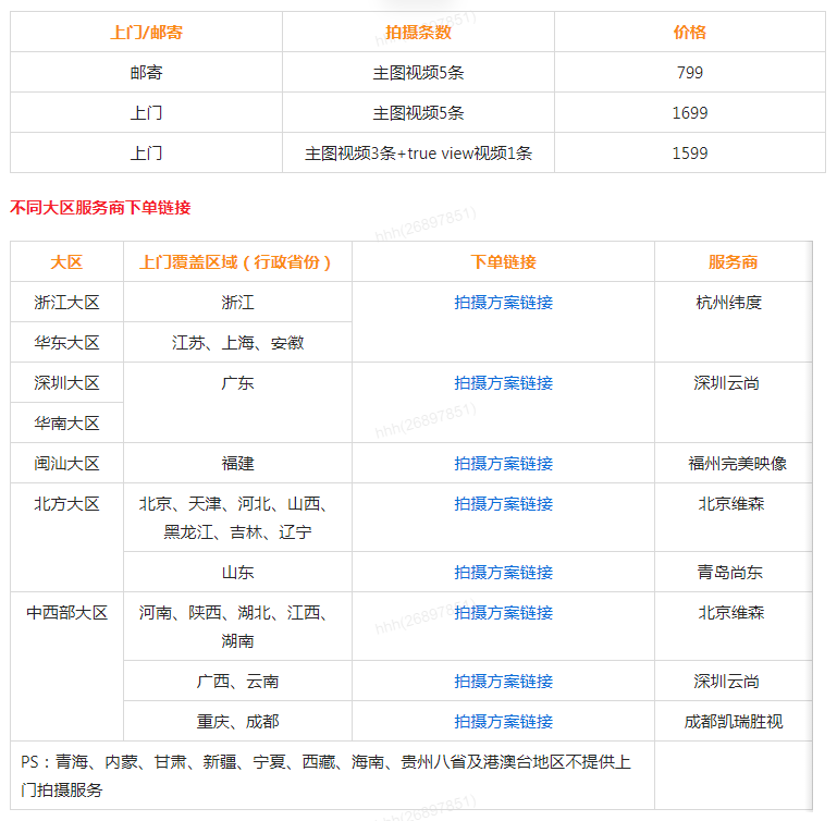 注:如客戶需要三方拍攝,外貿(mào)服務(wù)市場針對本次活動給出專屬拍攝優(yōu)惠,協(xié)助發(fā)布優(yōu)質(zhì)視頻,服務(wù)商拍攝優(yōu)先審核,具體方案如下,各大區(qū)商家可以根據(jù)指定服務(wù)商進(jìn)行下單