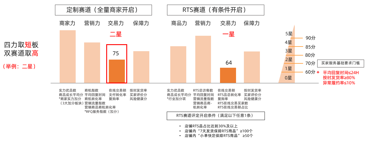 3. 客戶后臺會同時展現(xiàn)定制和快速交易兩套不同場景的評分指標(biāo)和商家表現(xiàn)數(shù)據(jù),依據(jù)以上規(guī)則確定定制和快速交易星等級。將取二者中較高的星級作為商家最終的(預(yù)測/評定)星等級。快速交易星等級僅在商家店鋪RTS品占比達(dá)到30%及以上才開啟評定,未達(dá)到此評定門檻時默認(rèn)0星,定制星等級不受此影響,對全量商家進(jìn)行評定。