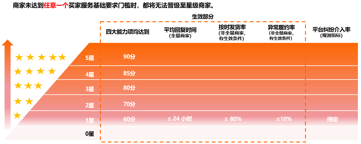 買家服務(wù)基礎(chǔ)要求門檻的指標(biāo)值和生效條件: