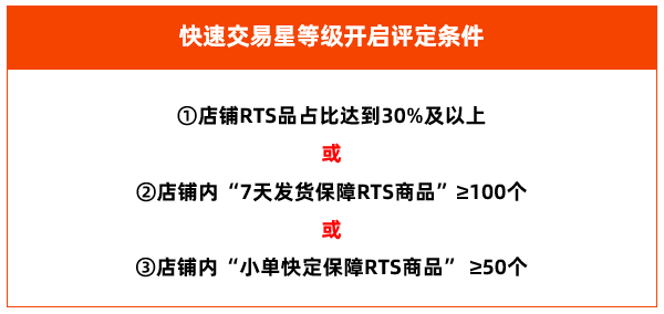 當(dāng)?shù)赇仢M足以下任意一個條件時,才可開啟店鋪快速交易星等級的評定,未達(dá)到此評定門檻時快速交易星等級默認(rèn)0星: