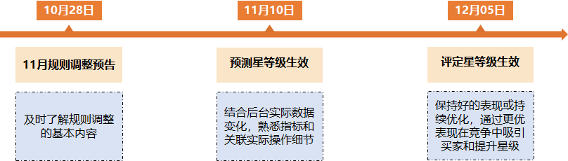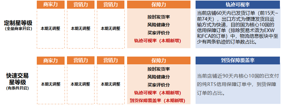 激烈的競爭環(huán)境下,高確定性的交付體驗是商家吸引高質(zhì)量買家的重要競爭優(yōu)勢。因此,商家星等級延續(xù)5.0版基本框架,計劃于2022年11月10日(周四)起在保障力板塊新增2類交付體驗指標,鼓勵商家通過提供高確定新的交付體驗吸引高質(zhì)量買家,獲取更多成交機會。本次調(diào)整不影響2022年11月5日更新的11月評定星等級,僅影響11月10日開始的預測星等級和12月開始的評定星等級。