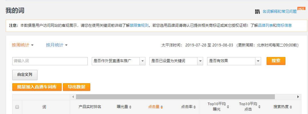 很多人都想打造爆款。爆款的前提條件一定是有足夠多的有效點(diǎn)擊量和訪客量,沒(méi)有客戶點(diǎn)擊你的產(chǎn)品,哪來(lái)的轉(zhuǎn)化詢盤(pán)。最后,記住”我的詞”更新時(shí)間:每周二上午更新,每月3號(hào)上午更新。每周都要操作”我的詞”,利用好”我的詞”,爭(zhēng)取做到Top 有點(diǎn)擊的詞,你一定也要有點(diǎn)擊量。
