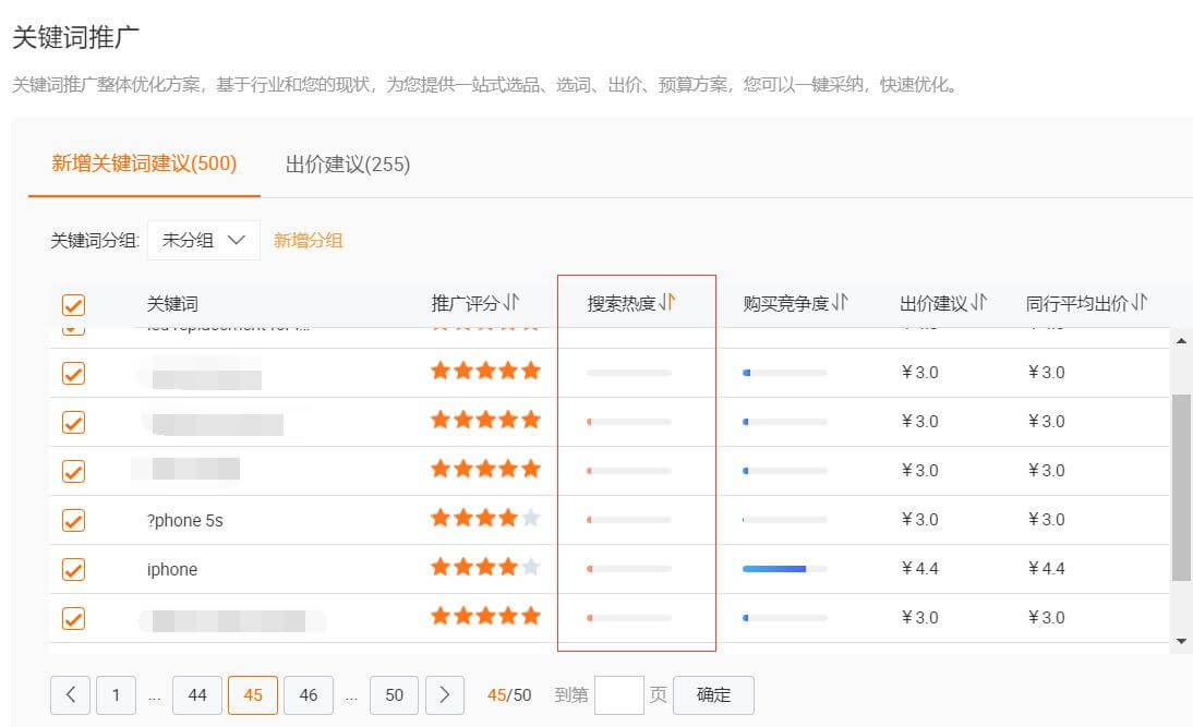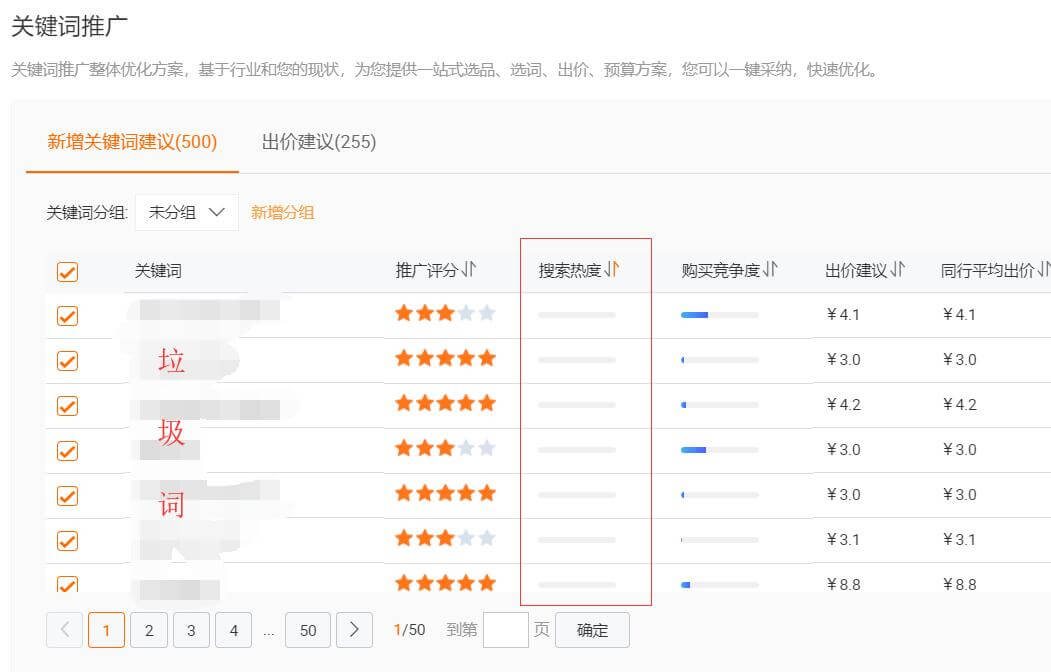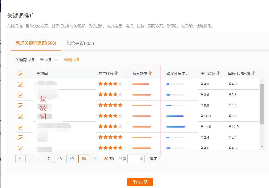 1、打開(kāi)關(guān)鍵詞推廣方案,一堆垃圾詞。先按關(guān)鍵詞搜索熱度排序,從低到高。方案包給的關(guān)鍵詞竟然還有沒(méi)搜索熱度的垃圾詞。
